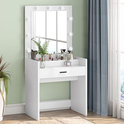 Vanity set with large drawer for women makeup 12 led bulbs lighted mirror cushioned stool table dresser desk for bedroom (white vanity dressing) overall: Ideal gift for teens and women. Giantex vanity table set with 12 lights mirror, bedroom makeup dressing table with 360° rotating oval mirror, 5 drawers and shelf, modern makeup table with cushioned stool for girls women (black) 4.2 out of 5 stars. 5 drawers and a removable organizer can provide ample storage space for your cosmetics, jewelry, nail polish and other beauty products. Vanity table set with led lighted mirror is an elegant and practical furniture in your home, the best choice for makeup.